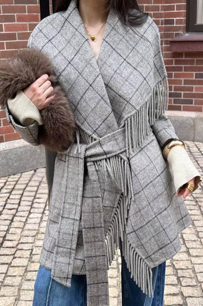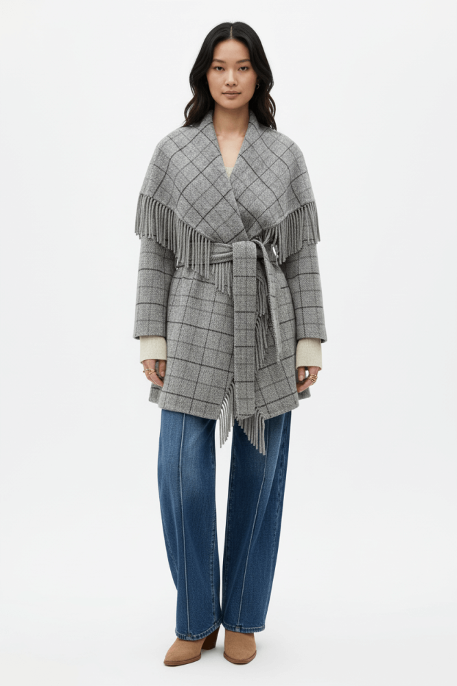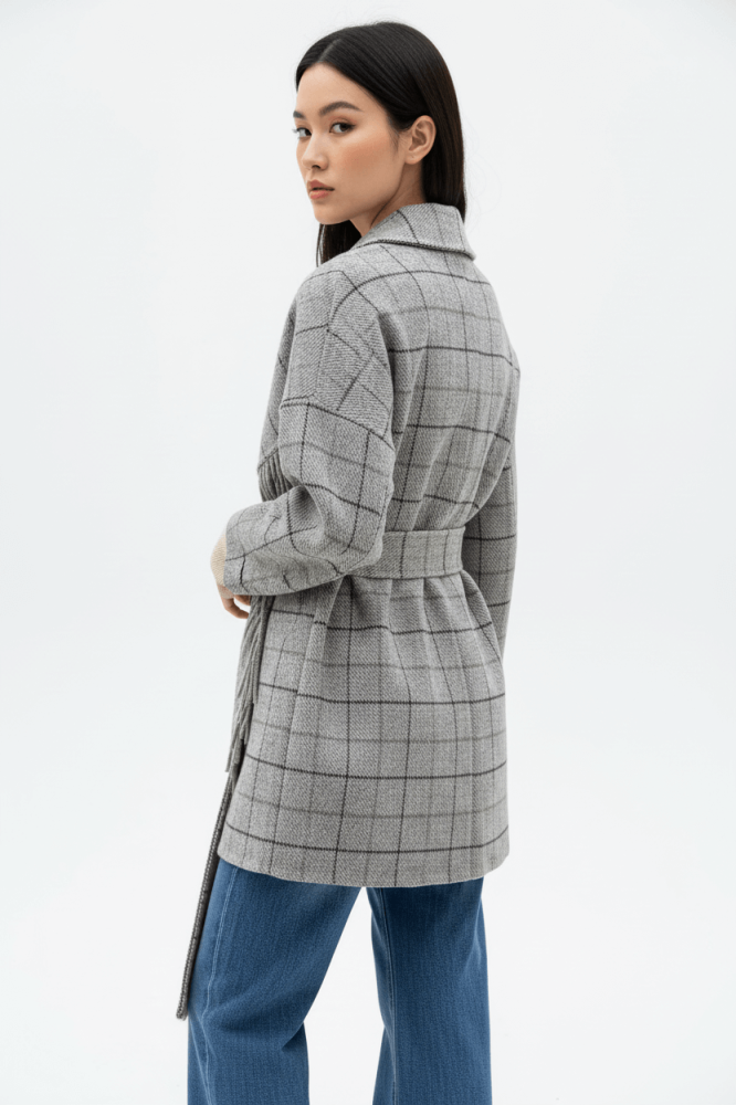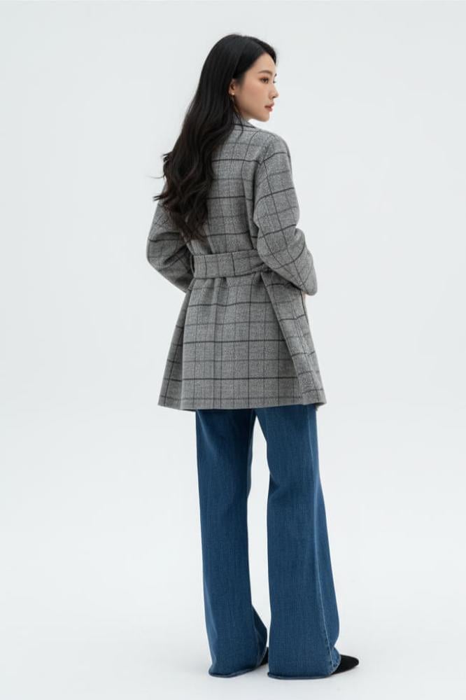 - التفاصيل: واسع عند الياقة، بطرف هدف على طول الجاكيت، مزود بحزام على الخصر.