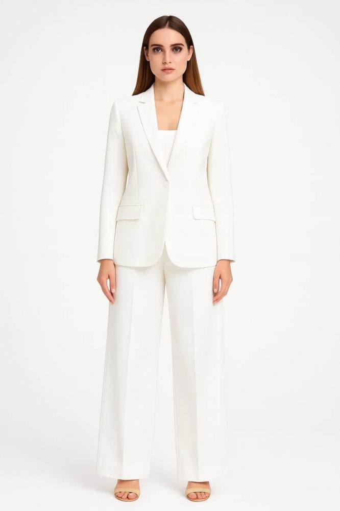 - نسقي بنطال أبيض طويل مع جاكيت رسمي بيج وحذاء كلاسيكي لإطلالة مكتبية متكاملة.