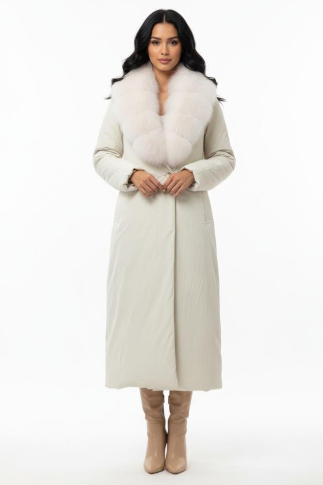 - التفاصيل: فرو كامل عند الياقة بلون أفتح، ربطة صغيرة على الخصر.