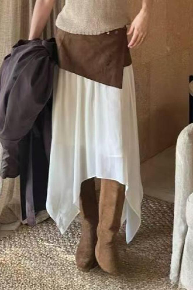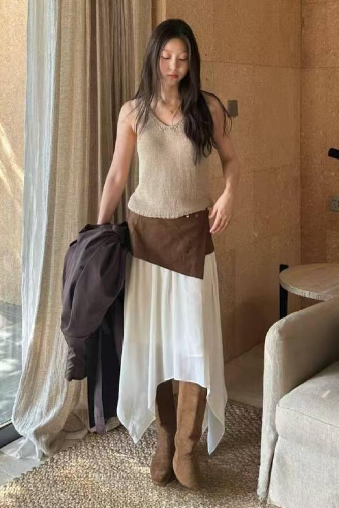 - التفاصيل: تصميم واسع مع أطوال مختلفة من الأسفل، مزينة بقطعة شمواه باللون البني الغامق عند الخصر.