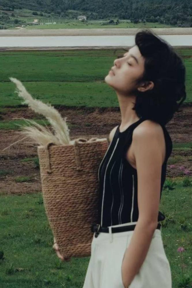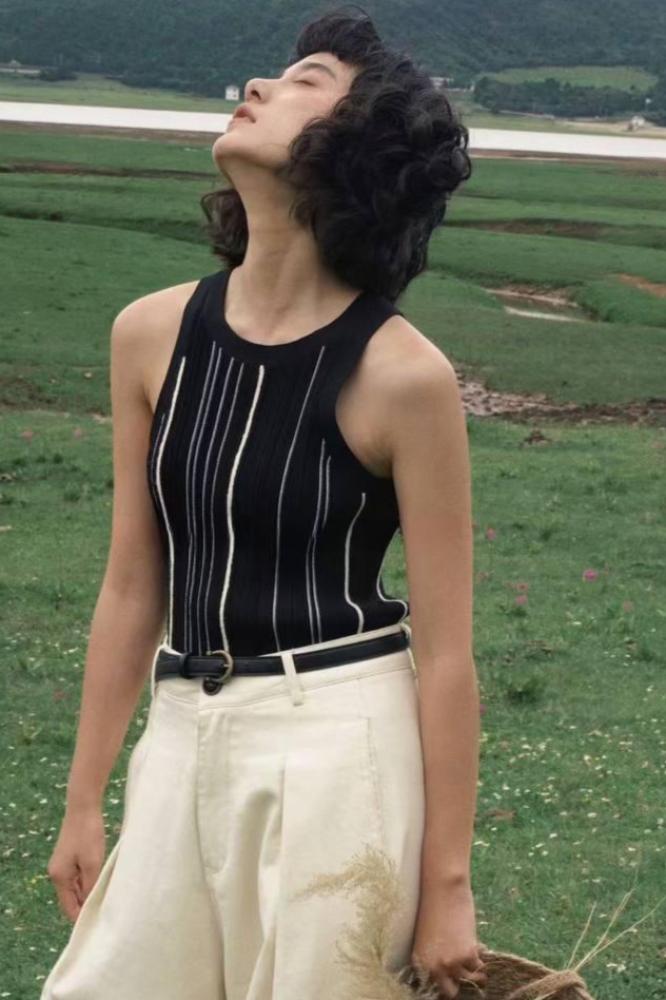 تانك توب باللون الاسود الانيق وبخطوط بيضاء منسدلة مصمم ليتناسب مع تنسيقاتك الانيقة