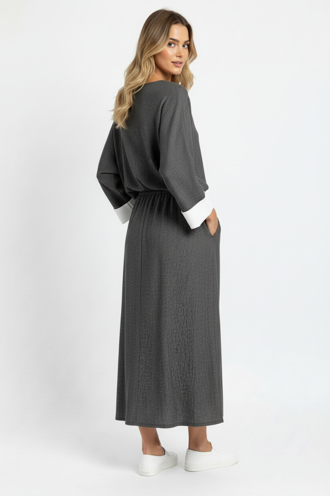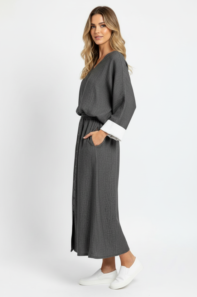 - Details: Long, wide sleeves in beige at the edges, and an elegant V-neckline.
