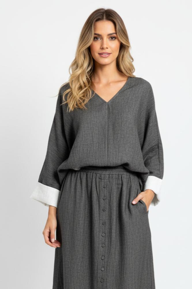 Start by trying on a gray blouse from Nuda, and complete the look by choosing wide-leg trousers for a complete outfit.