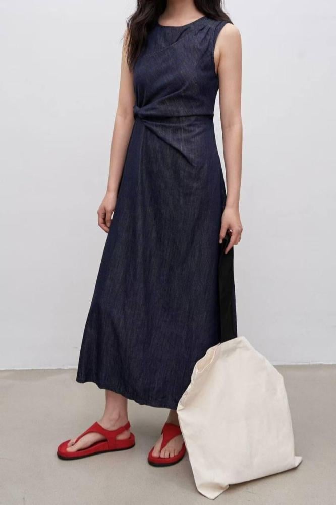 Elegant sleeveless midi dress made of denim with a modern design that combines simplicity and luxury.